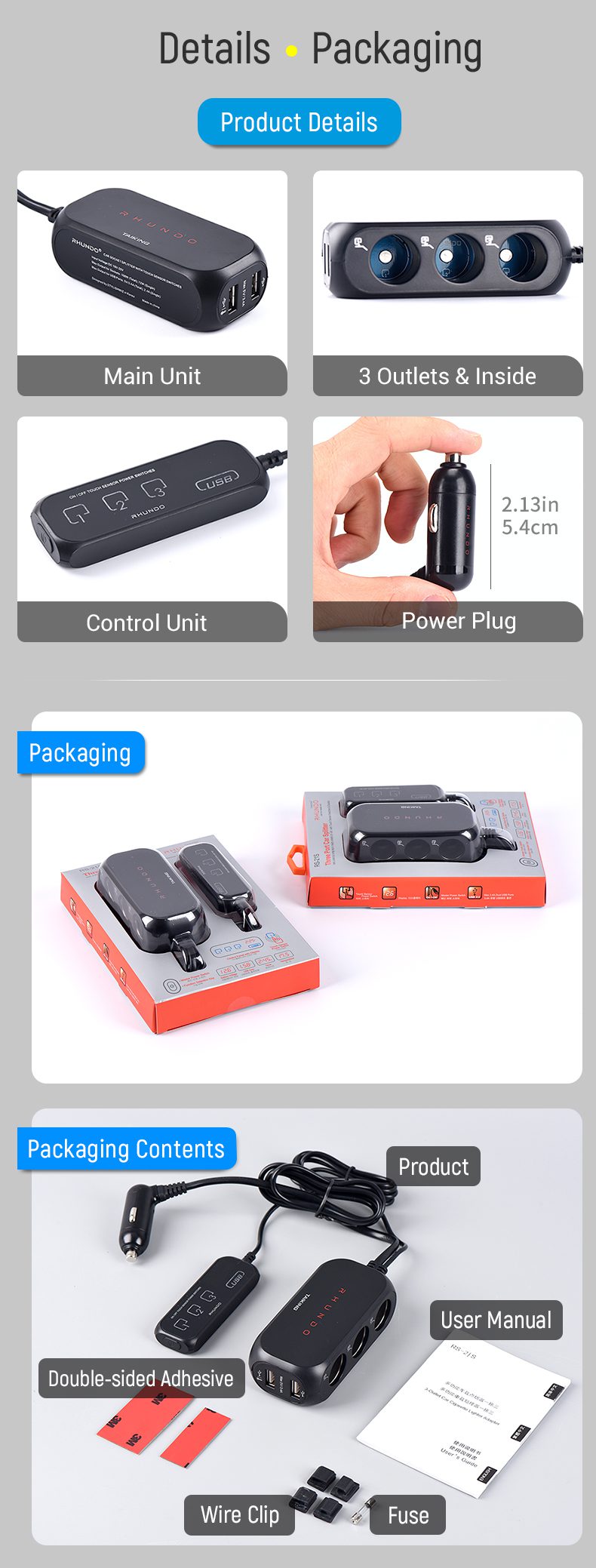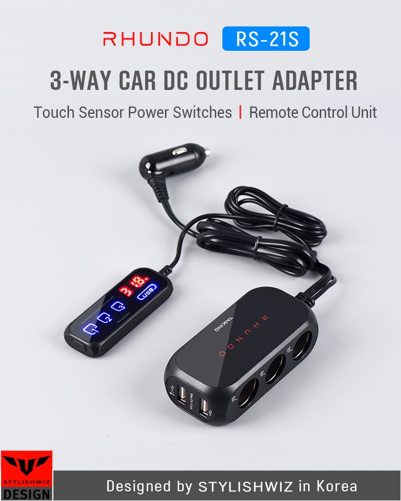 3in1 12V DC Outlet Splitter Cigarette Lighter Socket Adapter with Touch Sensing Switches RS-21S