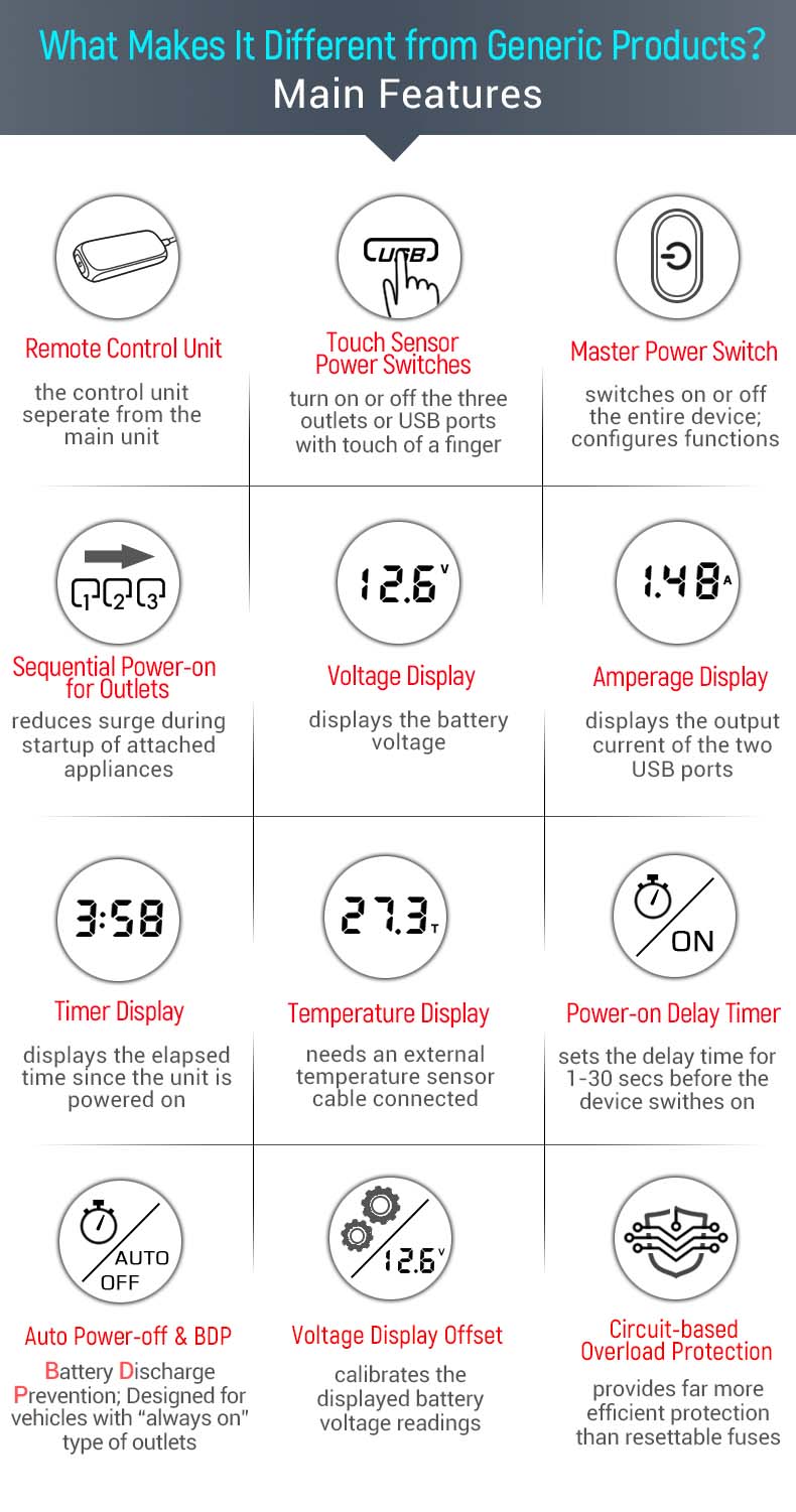 - Power-on Delay allows you to set the length of time for 1-30 secs between the moment the device is connected to the power supply and the moment it really switches on, to protect your attached appliances from the effect of voltage surges during the engine startup.