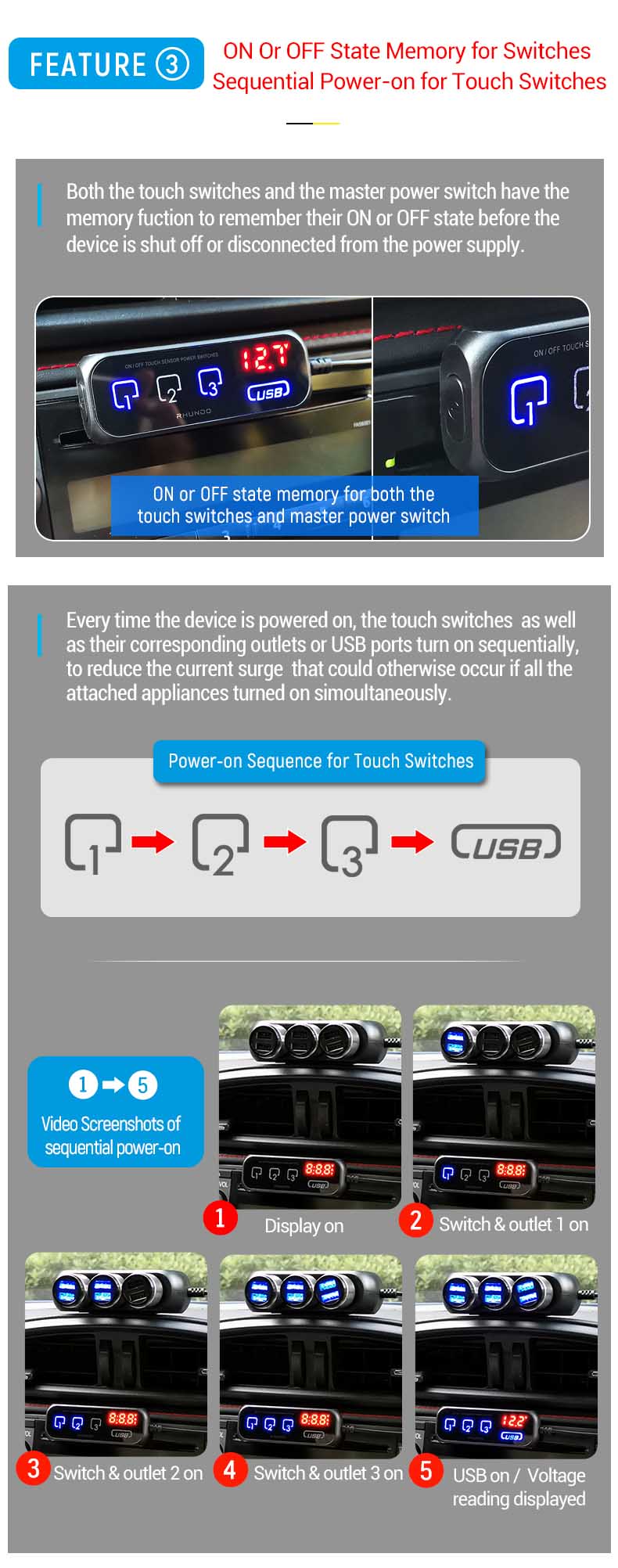 - The four touch sensing power switches allow you to turn/off the power for each of the three extended outlets or USB ports with touch of a finger.