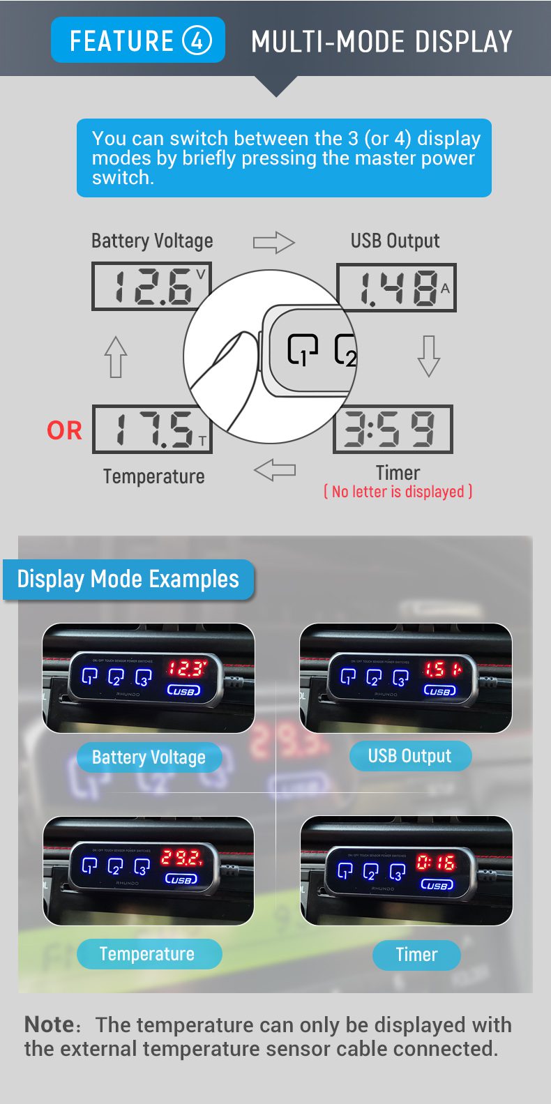 - With the high-precision external temp sensor cable attached, it can display temperature readings with the accuracy of ±5℃.